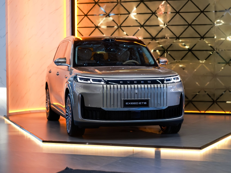 В рамках международной конференции Exeed анонсировал запуск полноразмерного гибридного кроссовера ET8. Модель станет частью стратегии бренда по расширению линейки гибридов и электромобилей. Габариты нового Exeed ET8 составляют 5205×1998×1800 мм, колесная база – 3120 мм. Передняя часть Exeed ET8 отличается монументальностью, сзади привлекают внимание диодная оптика с ромбовидным узором и высоко расположенный стоп-сигнал. В качестве внешнего декора используются хромированные элементы и 21-дюймовые многоспицевые колесные диски. В интерьере трехрядной версии Exeed ET8 центральное место занимает 30-дюймовый экран медиацентра с разрешением 6K и голосовым помощником на базе искусственного интеллекта. Цифровая приборная панель дополнена проекционным дисплеем высокого разрешения с возможностью вывода навигации. Пассажиры второго ряда могут воспользоваться выдвижным 17,3-дюймовым потолочным экраном развлекательной системы. Сиденья всех рядов оснащены электроприводом, подогревом, вентиляцией и массажем, спинки второго ряда имеют регулировку по наклону. Для кресел второго ряда предусмотрена выдвижная оттоманка, сиденье раскладывается с изменением угла наклона самого кресла. Кресла третьего ряда снабжены подогревом и электрорегулировками, а также электроскладыванием. Модель имеет 11 подушек безопасности, панорамную крышу площадью 2,6 м², трехзонный климат-контроль с функцией ароматизации воздуха, солнцезащитные шторки панорамного остекления с электроприводом на двух первых рядах, складные столики в спинках передних кресел, медиасистему с 23 динамиками и усилителем мощностью 2160 Вт, холодильник объемом 9,2 л с функцией нагрева и RGB-подсветку с 256 цветами и различными режимами ее работы. В отделке используются перфорированная кожа наппа, алюминий, алькантара. Exeed ET8 – последовательный гибрид (REEV), где 1,5-литровый бензиновый двигатель мощностью 156 л.с. не связан с колесами и выступает в роли генератора для подзарядки тяговой высоковольтной батареи емкостью 40 кВт·ч. Движение же обеспечивается двумя электромоторами совокупной пиковой мощностью 469 л.с. Запас хода Exeed ET8 исключительно на электротяге превышает 200 км по циклу WLTC, а общий запас хода при заправленном топливном баке и заряженной батарее достигает 1400 км. Средний же расход топлива составляет всего 6,1 л/100 км по циклу WLTC. Система зарядки тяговой батареи позволяет восполнить запас электричества от внешнего источника с 30% до 80% всего за 14,5 минут. Передняя подвеска Exeed ET8 оснащена алюминиевыми двойными поперечными рычагами, задняя подвеска – многорычажная. Модель имеет адаптивные амортизаторы CDC и систему пневматической подвески, позволяющие водителю настраивать её жесткость в зависимости от предпочтений и условий движения. Автомобиль получил систему полного привода, обеспечивающую непрерывную передачу крутящего момента на все четыре колеса. Предусмотрено также семь режимов движения для различных условий передвижения. Eхeed ET8 имеет ADAS, адаптивный круиз-контроль с функцией Stop&Go, систему предупреждения о столкновении с автоматическим торможением, контроль слепых зон, систему удержания в полосе движения, систему распознавания дорожных знаков и «умный» парковочный ассистент с функцией дистанционного управления через смартфон. Адаптированный для российских условий Exeed ET8 планируют вывести на ры